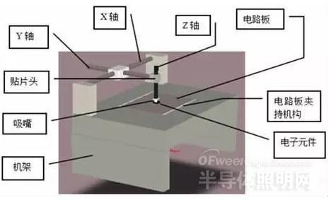 全自动LED 贴片机是由计算机控制,集光机电气为一体的高精度自动化设备,由机架、PCB 传送机构及承载组织、驱动及伺服定位体系、贴装头、供料器、光学识别体系、传感器和计算机控制体系组成,其经过吸取-位移-定位-放置等一些功能,完成了把SMD 快速准确的贴装到PCB 板上。